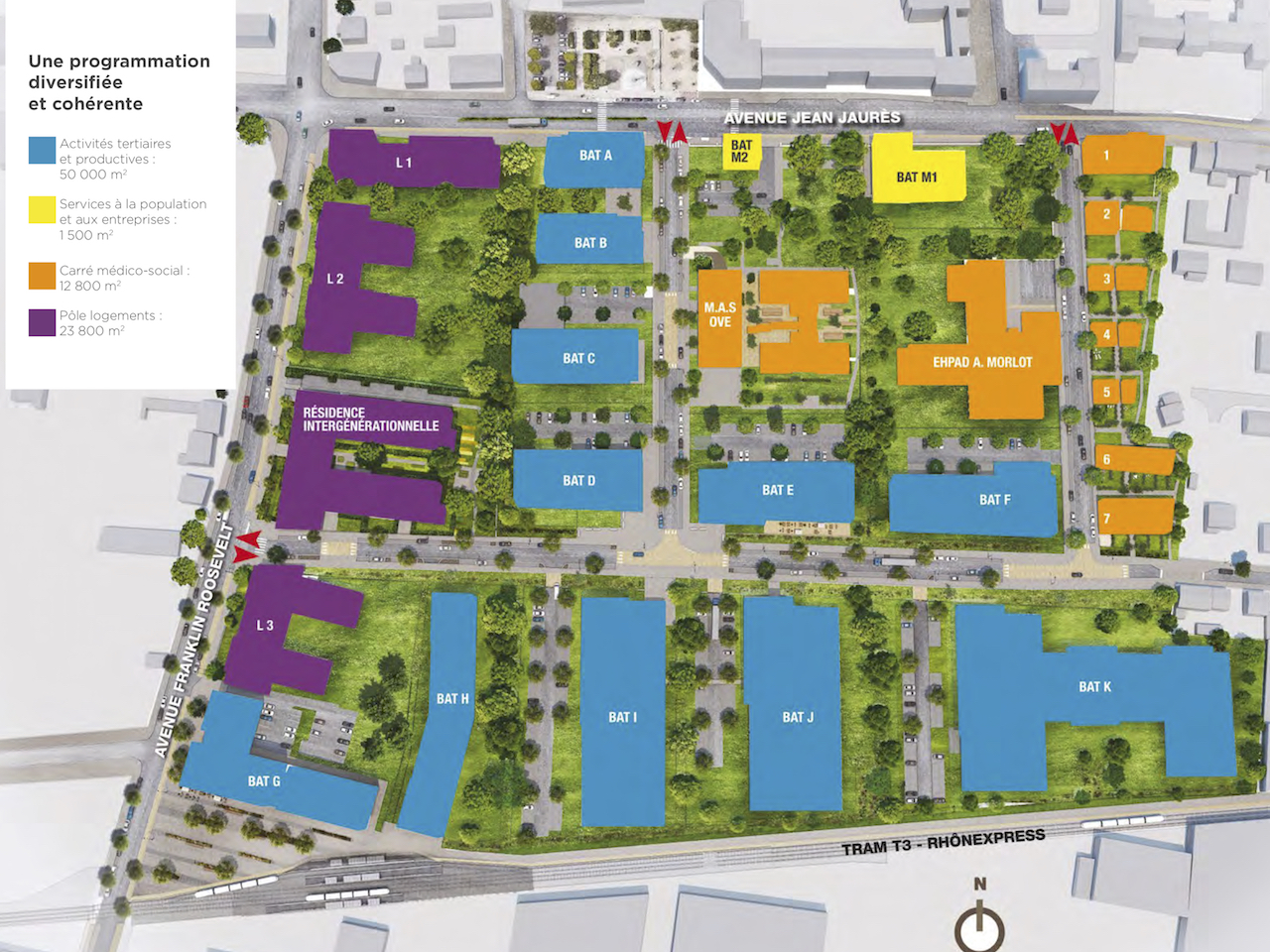 Si l’Ehpad Albert Morlot est déjà sorti de terre, tout le reste ou presque est encore à faire. L’aile ouest de la zone sera couverte de logements, du studio au T6, et dont certains biens seront cessibles. Au nord-est sera concentré le pôle médico-social tandis que deux bâtiments dédiés au service de la population, comme des crèches ou des espaces de coworking, verront le jour au nord. Le reste sera constitué de 11 bâtiments pour des activités tertiaires.