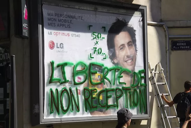 Deux panneaux de 8m² ont été pris pour cible, au croisement des rues Felix Faure, Jean Jaurès et Guillotière dans le 7ème arrondissement de Lyon. Les Déboulonneurs ont barbouillé des slogan du type « La pub nous fait dé-penser » et « Liberté de non réception. » Ils ont immédiatement revendiqué leurs actes en allant déposer une main-courante au commissariat d’arrondissement. Ce type de happening, qui tient plus de la désobéissance civile que du vandalisme, vise à éveiller le grand public face aux importants reculs politiques en matière de publicité extérieure, suite aux propositions votées le 30 juin dans la loi Grenelle II.
