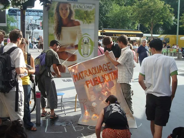 C’est tout un mouvement activiste qui se propose d’aller à l’encontre d’un ordre établi qu’on estime injuste, mal fait ou pas adapté à une situation. Donc ça peut inclure le fait d’enfreindre la loi, mais de manière totalement assumée et non-violente, pour chercher à remettre en cause un état de fait. Concrètement, dans le cadre de nos actions, nous barbouillons des panneaux publicitaires, notamment les grands panneaux 4x3 qui fleurissent dans nos villes. Ce sont des actions de dégradations, légères mais faites au grand jour et à visage découvert, avec nos papiers. On sait que la police est amenée à intervenir. Effectivement, on enfreint la loi, on dégrade un bien. Le but de cette action de désobéissance est de montrer qu’elle peut être légitime, puisqu’on estime qu’il y a beaucoup trop de publicités, beaucoup trop de matraque publicitaire.