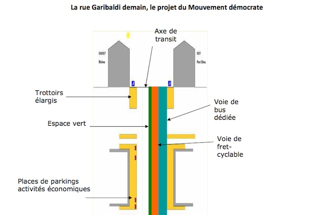 Le Modem propose ainsi de libérer une voie de fret-cyclable sur l’ensemble des voiries. Techniquement, le schéma d’aménagement prévoit d’ouest en est de la rue Garibaldi : deux axes de transits dédiés aux véhicules particuliers sur 6 mètres - contre trois sur le projet du Grand Lyon - une bande verte d’1,5 mètres contiguë séparant des voitures la piste cyclable de 4 mètres (autorisant par sa largeur le fret-cyclable), et une ligne de bus sur 6 mètres de voirie.