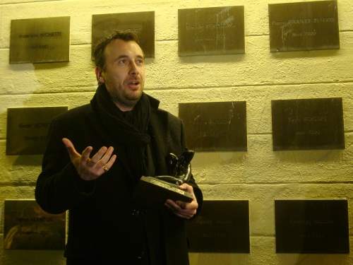 La soirée s'est terminée par la remise du trophée, une statue de femme avec un papillon sur l'épaule (hommage à un film de Jacques Deray) que la veuve de Jacques Deray a remis à Fred Cavayé. Le jeune réalisateur a ensuite eu l'honneur, comme le veut la tradition, d'aller dévoiler une plaque à son nom sur le mur extérieur de l'Institut dans la rue du Premier Film. Sa plaque dorée est fixée à côté de celle d'un monstre du cinéma français, Jean Louis Trintignant, de passage à l'Institut en octobre dernier.