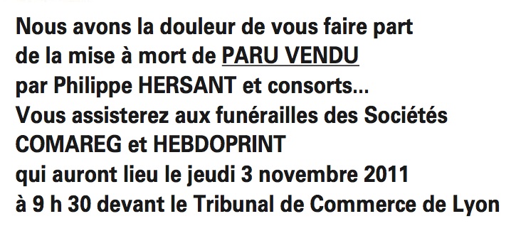 Depuis quelques jours, je ne décolère pas !!!! Ancienne de la Presse Gratuite - Promafair, Comareg et finalement co-créatrice de Paru Vendu (certains me reconnaitront, je l'ai payé très cher à l'époque !!). Je ne décolère pas de savoir Paru Vendu liquidé. !! De savoir que personne n'a levé le petit doigt pour reprendre le premier groupe de presse gratuite en France ! La conjoncture est une chose, la volonté en est une autre.