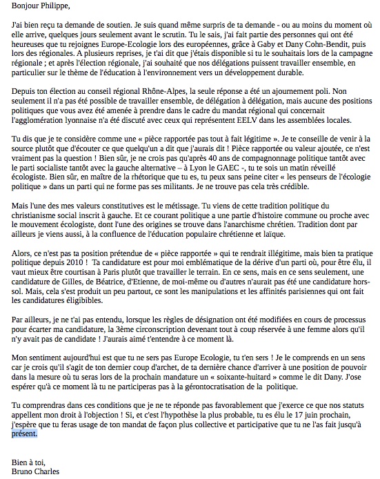 "Mon sentiment aujourd'hui est que tu ne sers pas Europe Ecologie, tu t'en sers (...) Si, et c'est l'hypothèse la plus probable, tu es élu le 17 juin prochain, j'espère que tu feras usage de ton mandat de façon plus collective et participative que tu ne l'as fait jusqu'à présent", termine Bruno Charles, qui fera donc jouer son droit à l’objection pour ne pas soutenir.