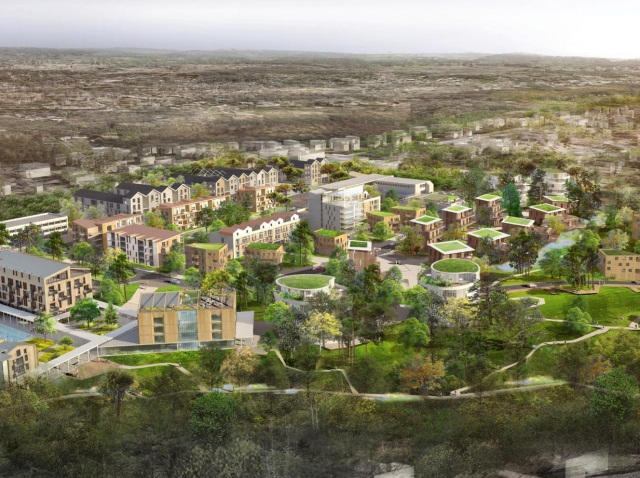 Le cinquième projet, présenté par Nexity SIER propose une surface de 47 980m². Tous les bâtiments seraient conservés sauf la villa et l’amphitryon. Le bâti tourne ici le dos à la route de Paris et une centralité intérieure est créée autour du centre de bien-être et d’un restaurant de 475m². Les logements seraient répartis sur l’ensemble du site, y compris donc dans le vallon et la combe. 30 740m² de logements sont prévus, dont 9 320 de logements sociaux, 18 parcelles de logements individuels, 3 120m² de logement abordable, 18 300m² de logement libre et 7 690m² pour une résidence séniors. Il faudrait également compter avec 2 610m² de bureaux, un centre de santé de 2 190m², une maison des usages de 190m², 1 425m² de commerces, l’hôtel conservé sur 2 280m² et une maison médicale de 1 500m².