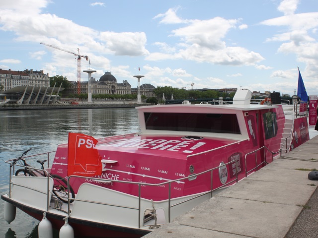 Un bateau rose vif en référence à la couleur principale du parti qui