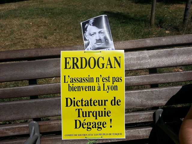 Ils étaient au final près de 500 manifestants à se rassembler à la mi-journée avec à l'appui des affiches et pancartes où les slogans suivants étaient visibles : "Erdogan, l'assassin n'est pas bienvenu à Lyon", "La paix pour tous les peuples", "Tu n'as rien à faire là où le peuple vit".