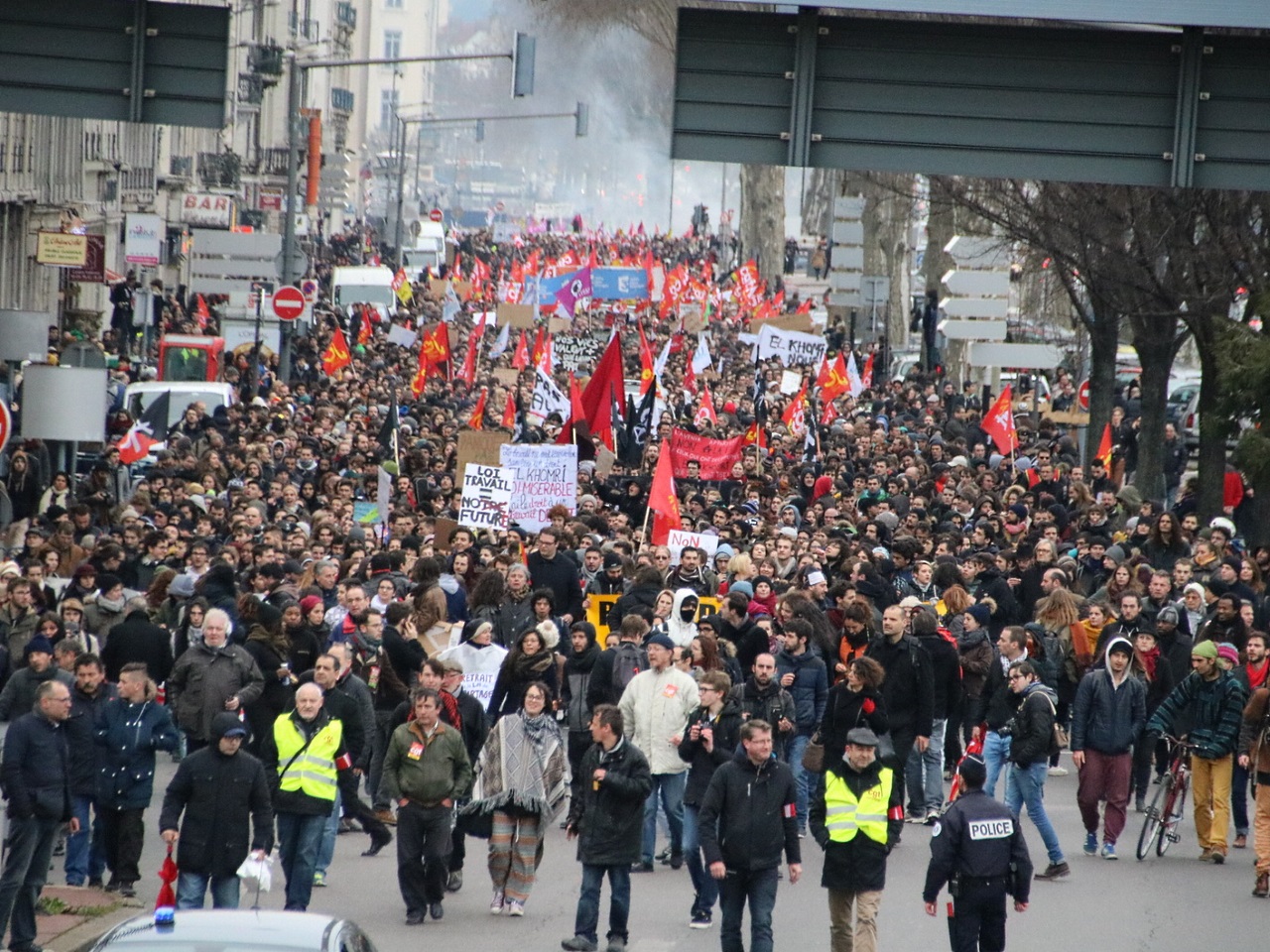 "Lycéens, étudiants, travailleurs, on va gagner tous ensemble" ou encore "Manu, t'es foutu, la jeunesse est dans la rue" résonnaient notamment dans une foule très jeune, principalement étudiante. Le lycée Saint-Just dans l'agglomération a été bloqué dans la matinée, tout comme 90 établissements en France.