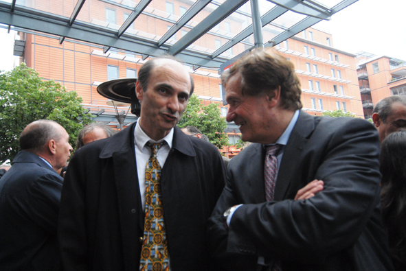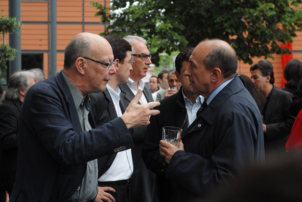 L'adjoint Verts Etienne Tête en discussion avec le Pr Daniel Malicier, patron de l'institut médico-légal de Lyon et candidat PS dans le 5e canton.