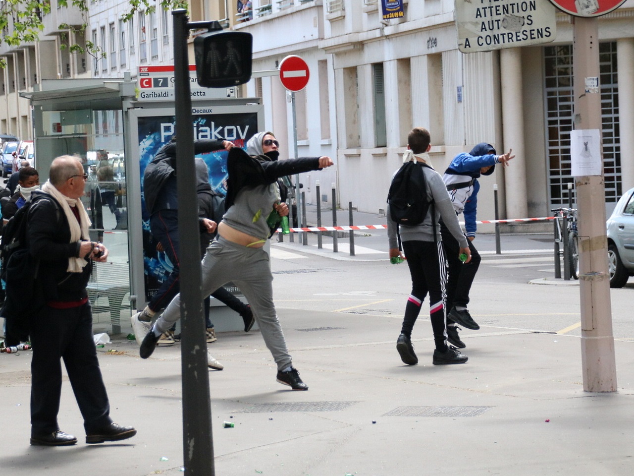 Mise à jour à 14h30 : le cortège est bloqué, des incidents éclatent à l'angle Gambetta-Garibaldi. Des manifestants jettent des bouteilles sur les forces de l'ordre.