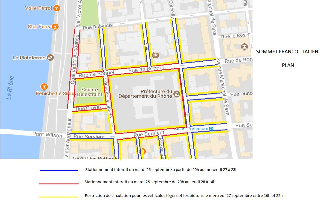 Puis Emmanuel Macron et Paolo Gentilono seront attendus en préfecture du Rhône. Le quartier du 3e arrondissement sera alors bouclé. Dès 16h ce mercredi, le périmètre de sécurité (cliquez sur la carte) empêchera toute circulation automobile jusqu’à 22h. Quant aux transports en commun, ils seront déviés (bus) ou ne s’arrêteront pas au sein du périmètre (tramway T1). Là encore, jusqu’à 22h.