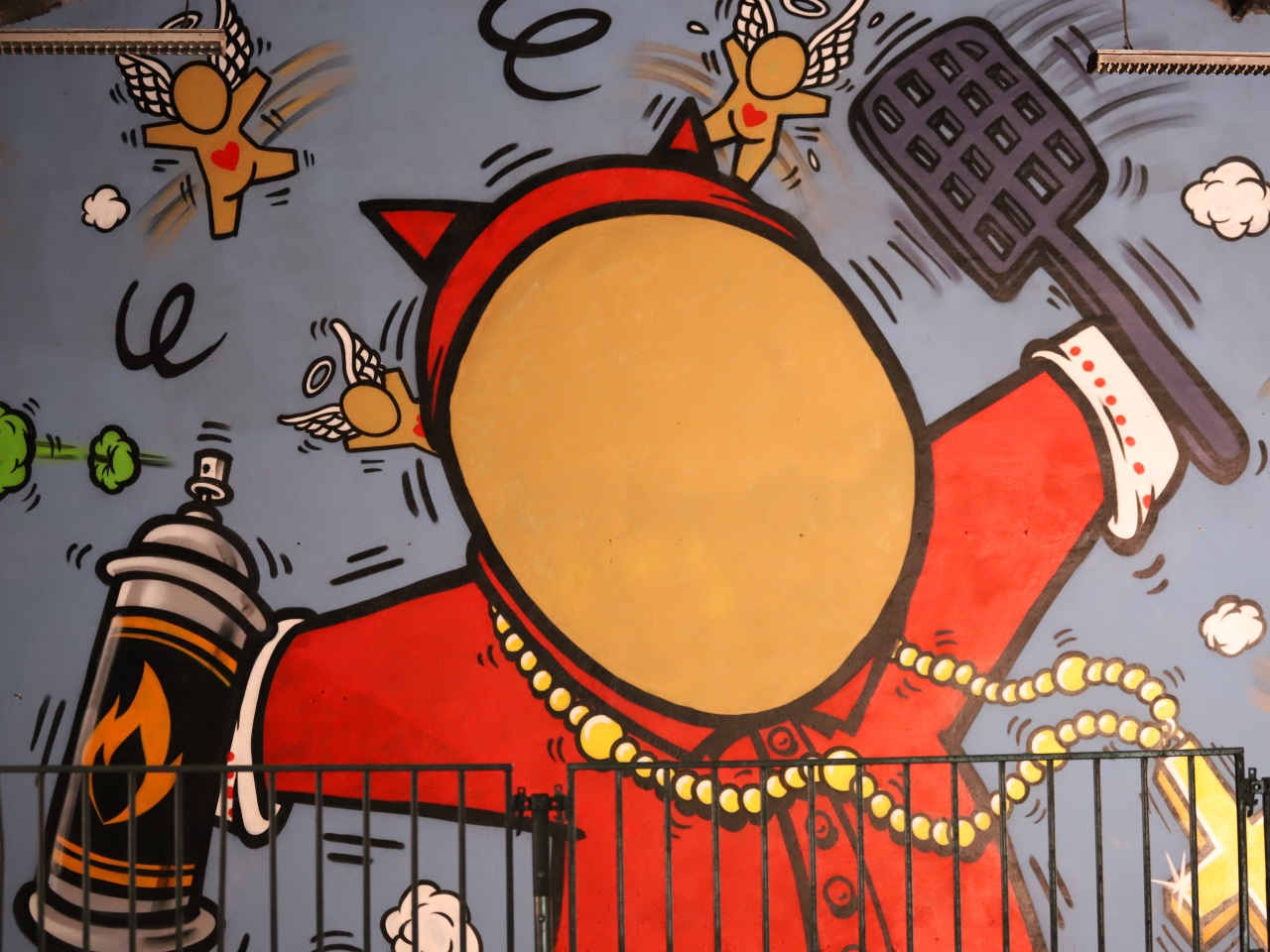 Les couleurs des différentes peintures murales viennent contraster avec la noirceur des lieux. Au milieu de la salle, des ateliers sont proposés permettant de jouer avec la réalité virtuelle et augmentée.