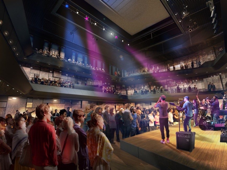 Le troisième point fort du projet est la réhabilitation de la salle de concert qui pourra accueillir 500 places assises et 840 places en configuration mixte assis/debout. Cette salle de spectacle sera entièrement réaménagée "l'axe de la scène sera pivoté de 90° pour mettre les artistes au cœur de l'espace scénique".