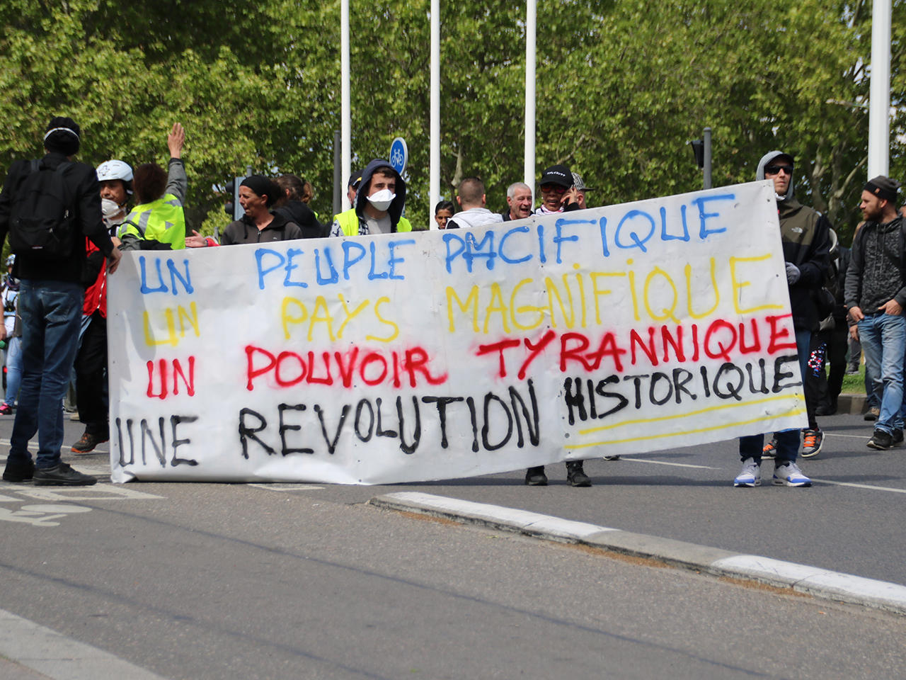 Lu sur la pancarte :"Un pouvoir tyrannique " Bandes de boulets jaunes décérébrés . Allez fair un tour au Venezuela pour y savourer "un pouvoir démocratique " !!!!!!!