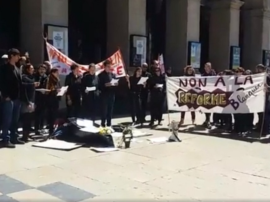 Plusieurs dizaines de profs, venus notamment de Bron, Villeurbanne et Vaulx-en-Velin, ont mis en scène "l'enterrement de l'école publique pour protester contre la loi Blanquer".