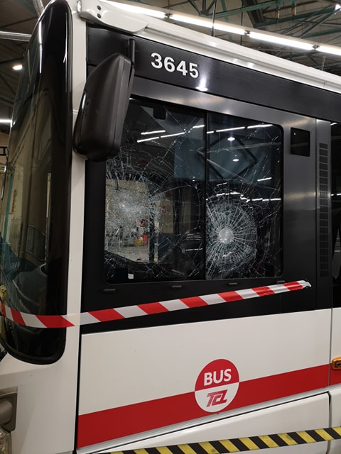 Dès 17h, des projectiles ont été lancés sur des bus des lignes C15 et 52, à la limite entre les communes de Bron et Vaulx-en-Velin, vers la route de Genas. D’après Keolis, 4 véhicules ont été atteints par des pavés, dégradant de nombreuses vitres. Certains projectiles ont également réussi à transpercer la couche de protection des glaces. Selon nos informations, quatre personnes ont été légèrement blessées lors de ces caillassages. Un chauffeur a reçu un projectile directement sur lui alors qu’il roulait la fenêtre ouverte. Il est en arrêt. De plus, deux clients et un autre chauffeur ont été légèrement touchés par des bris de verre. Les sapeurs-pompiers ont dû intervenir. Plusieurs plaintes ont été déposées.
