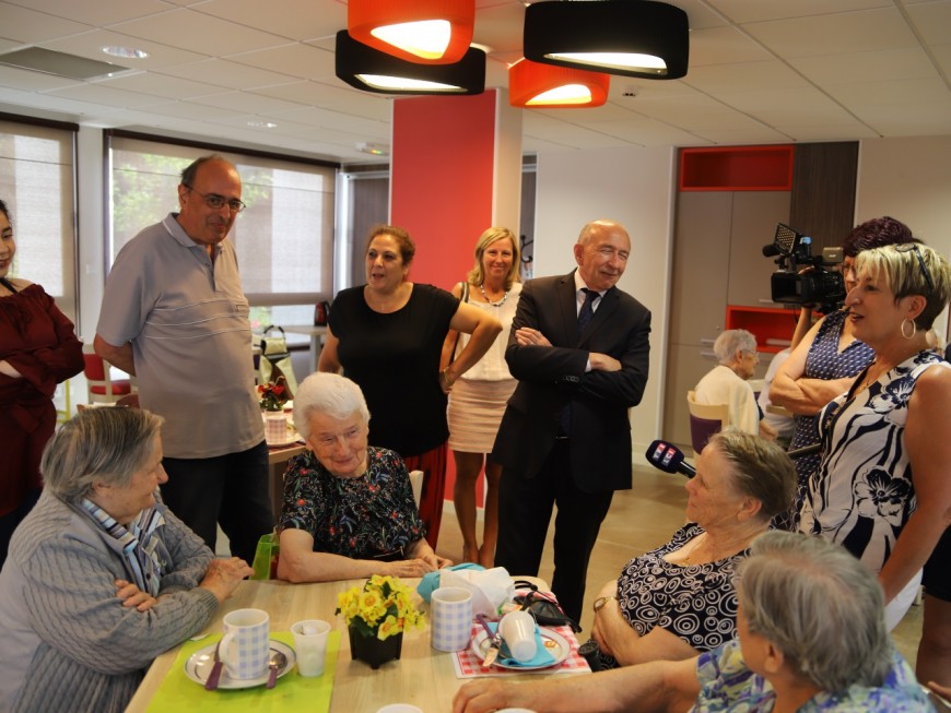 Quand Gérard Collomb et le groupe entrent dans la résidence Chalumeaux, dans le 8e arrondissement, les personnes âgées attendent sagement devant un petit déjeuner achevé, organisé une ou deux fois par mois. L'ancien sénateur salue un à un les résidents attablés, avant de s'écrier "Bon alors, la canicule on la sent pas ici !". Une résidente rétorque "dans les appartements, si !". La directrice change de sujet : "on a fait le choix d'ouvrir la résidence aux personnes âgées extérieures à l'établissement. On ouvre nos salles climatisées jusqu'à tard le soir". La personne âgée reprend ensuite sa discussion avec ses amies au sujet de la chaleur dans leurs chambres.