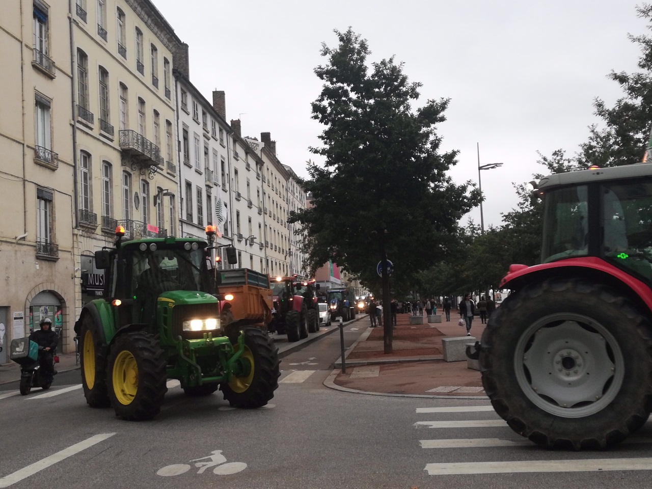 Plusieurs points de rendez-vous avaient été déclarés, notamment à Brignais, Beynost et La-Tour-de-Salvagny. Au final, environ 150 tracteurs ont convergé vers Lyon, en réalisant des opérations escargots, et même en déversant des pneus sur l'autoroute comme cela a été constaté sur l'A6. Le tunnel sous Fourvière a donc été fermé peu avant 13h pour éviter un accident.