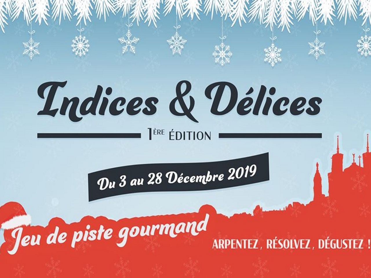 Jusqu’au 28 décembre, les deux start-up lyonnaises, Praline et Rosette (organisatrice de balades gourmandes) et Hally Event (créatrice de jeux de pistes) proposent aux Lyonnais et aux touristes un jeu de piste gourmand de 2h à faire entre amis ou en famille dans les rues de la Presqu’île de Lyon. Enigmes et dégustations sont notamment au programme. Toutes les informations sur le www.indicesetdelices.fr