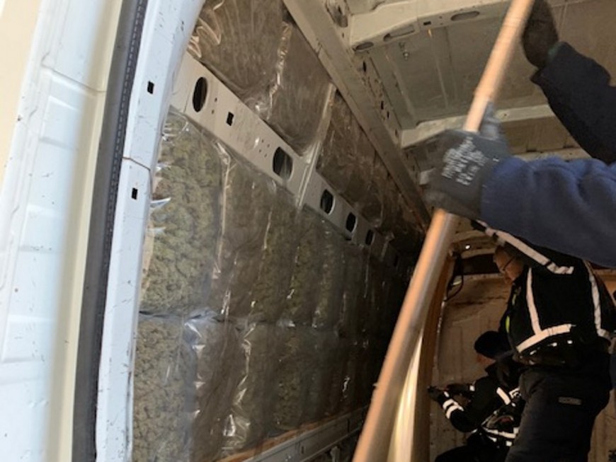 Le démontage intégral des parois intérieurs du véhicule, recouvertes de panneaux en bois, permettait aux douaniers de découvrir plus de 150 sacs thermosoudés contenant de l’herbe de cannabis pour un poids total dépassant les 65 kilos.