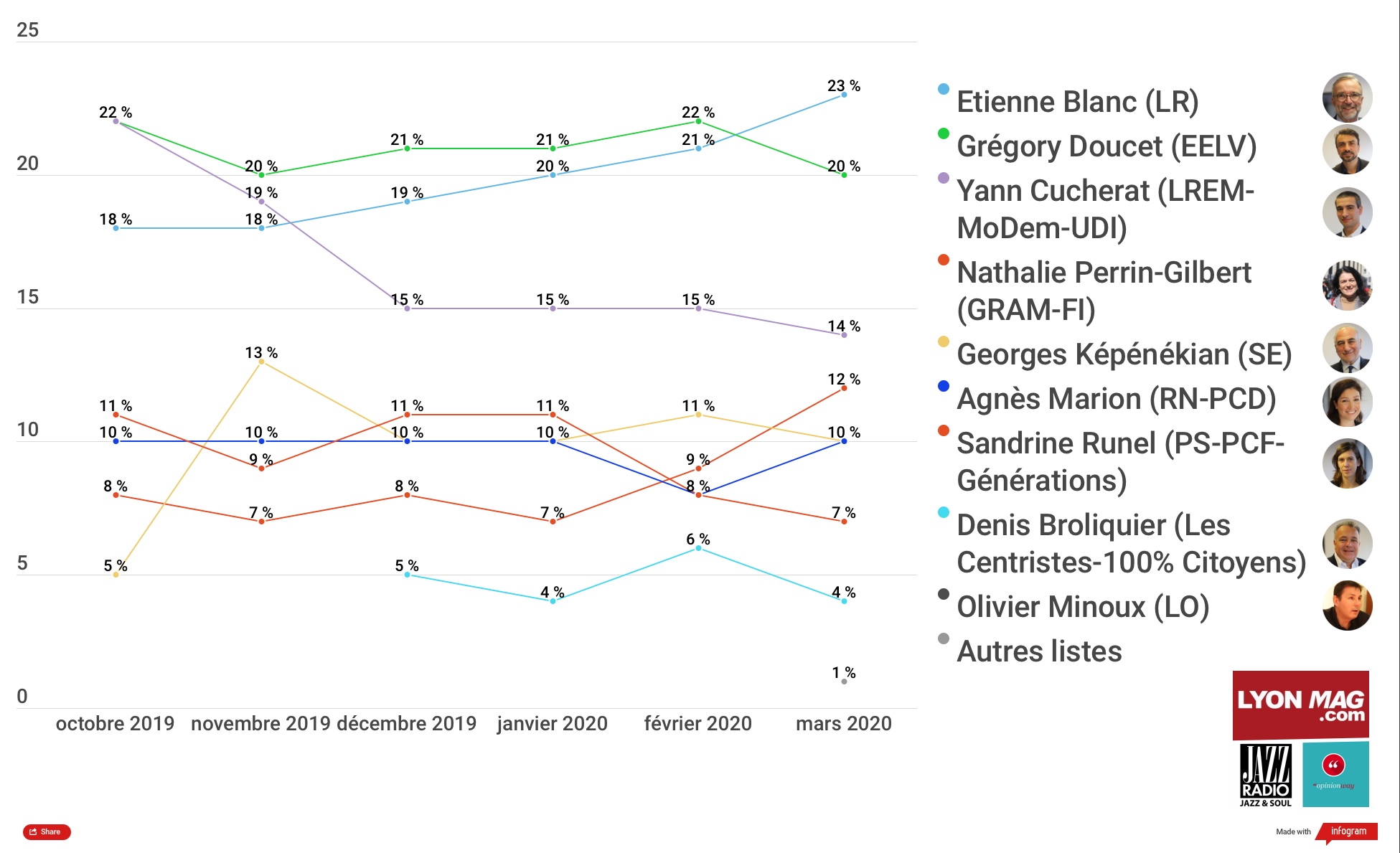 Signaler RépondreDernier sondage logique au vue des préoccupations des lyonnais : la sécurité et la qualité de l'air. Le vote utile devrait jouer pour les verts et les LR qui vont siphonner les voix des autres candidats.