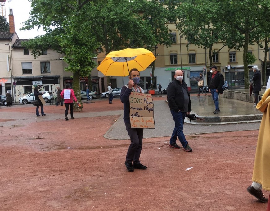 Dans le 4e arrondissement de Lyon, moins d’une dizaine de personnes se sont retrouvées vendredi matin sur la place de la Croix-Rousse. Dotés de masques, de parapluie et de pancartes, les manifestants ont souhaité rappeler au gouvernement que la lutte sociale restait active malgré le confinement.