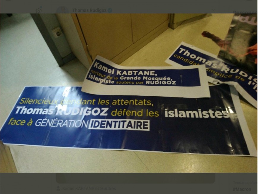 "Silencieux pendant les attentats, Thomas Rudigoz défend les islamistes face à Génération identitaire", peut-on notamment lire sur les affiches en question. Il est également question du recteur de la Grande Mosquée de Lyon, Kamel Kabtane, "islamiste soutenu par Rudigoz".