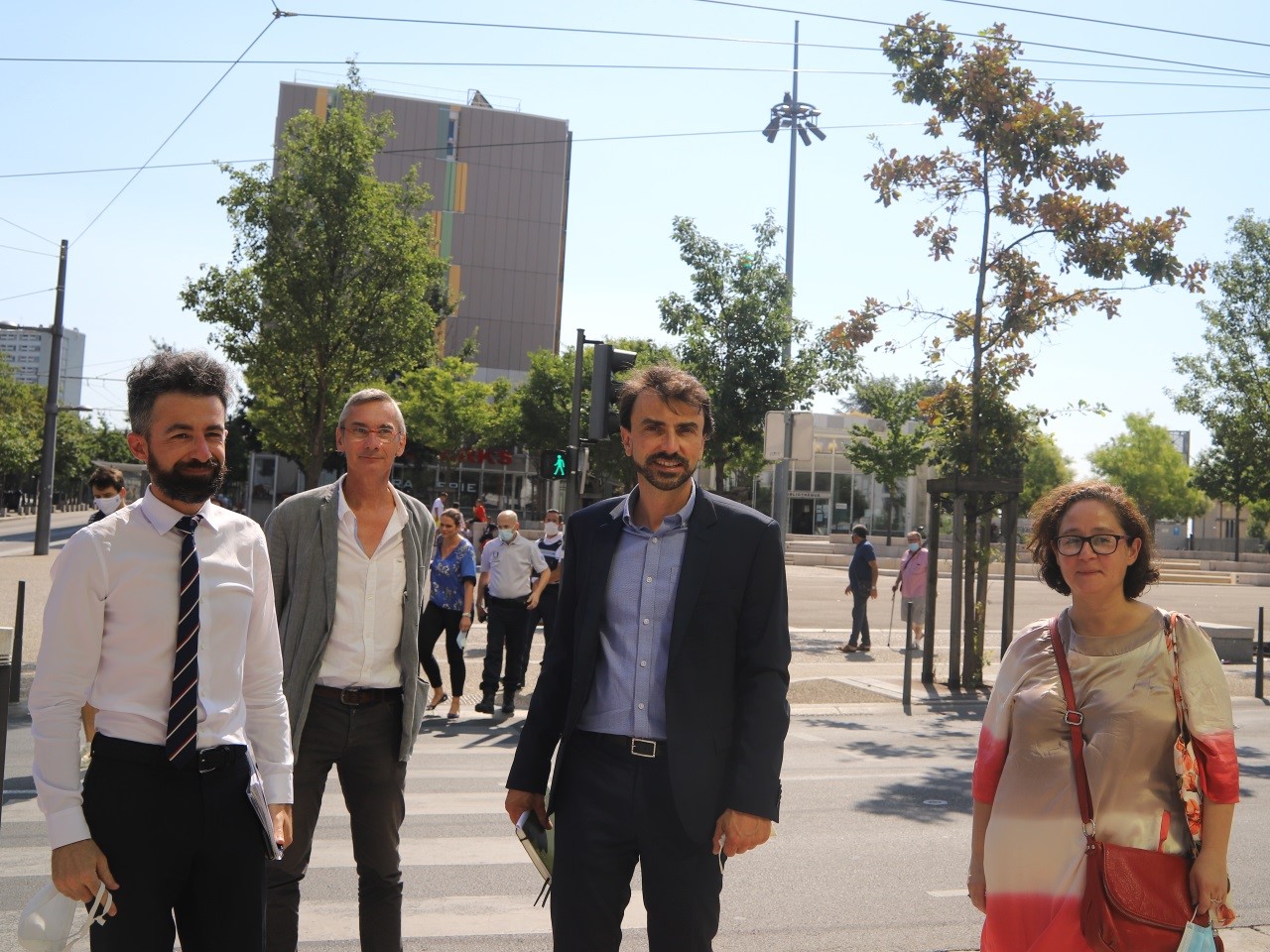Après une réunion au poste de police municipale de la rue Marietton, qui avait été attaqué durant le 14 juillet, les élus se sont rendus au cœur du quartier de la Duchère, toujours dans le 9e arrondissement de Lyon. Un spectacle peu courant sur la place Abbé Pierre, symbole du renouveau du quartier, qui n’a pas manqué d’intriguer les habitants en terrasse ou profitant de l’ombre des quelques arbres. Après quelques pas sous le cagnard, une rencontre a été organisée dans le magasin Krys, pillé il y a quelques jours, là encore lors de la soirée de la Fête Nationale.