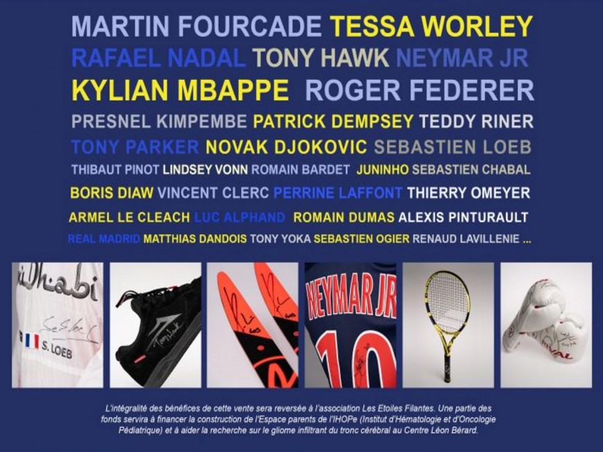 Ce sont en effet une centaine d’athlètes qui ont décidé de se mobiliser à cette occasion en donnant des objets qu’ils ont portés. Martin Fourcade, Tessa Worley, Rafael Nadal, Kylian Mbappé, Roger Federer, Tony Yoka ou encore Tony Parker ont cédé maillots, raquettes, gants de boxe... pour la bonne cause, soit 107 lots à acquérir.