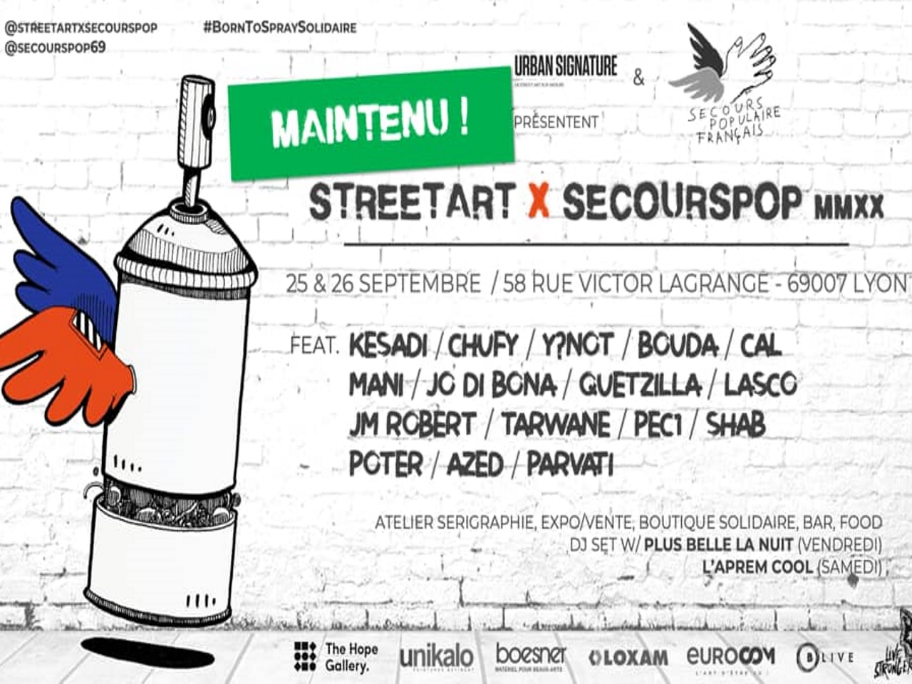 Ce sont en tout 15 artistes qui vont œuvrer ce vendredi et ce samedi sur les murs du siège du Secours Populaire du Rhône, rue Victor Lagrange dans le 7e. Il s’agit de la 1ère édition du Streetart x Secourspop MMXX avec au programme des ateliers, une exposition, une boutique solidaire. Le festival a pour but de collecter des fonds à destination des actions de solidarité pour les 15 000 personnes aidées dans le département.