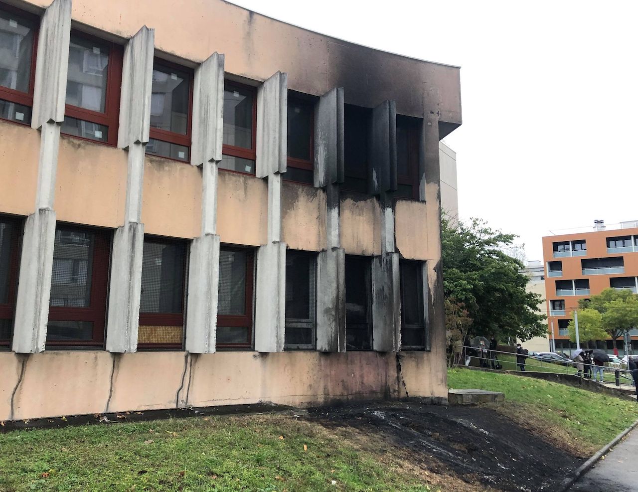 Devant l’église Saint-Pierre Chanel, qui porte sur sa façade noircie les stigmates de la tentative d’incendie perpétrée ce week-end, le ministre de l’Intérieur s’est entretenu avec le maire LR de la commune en proie à des émeutes, Alexandre Vincendet, et avec des responsables religieux, notamment Michel Dubost, administrateur apostolique de Lyon.