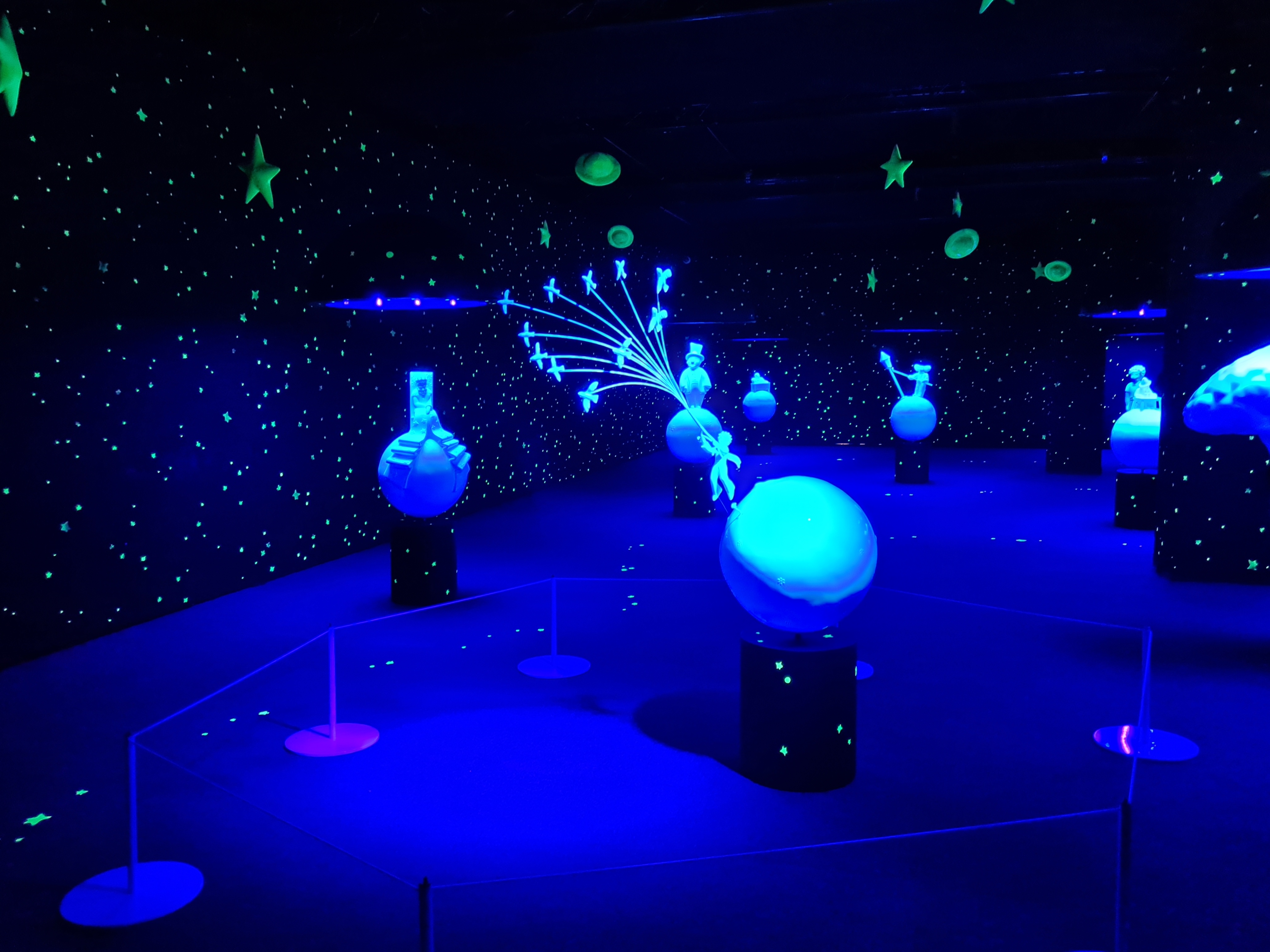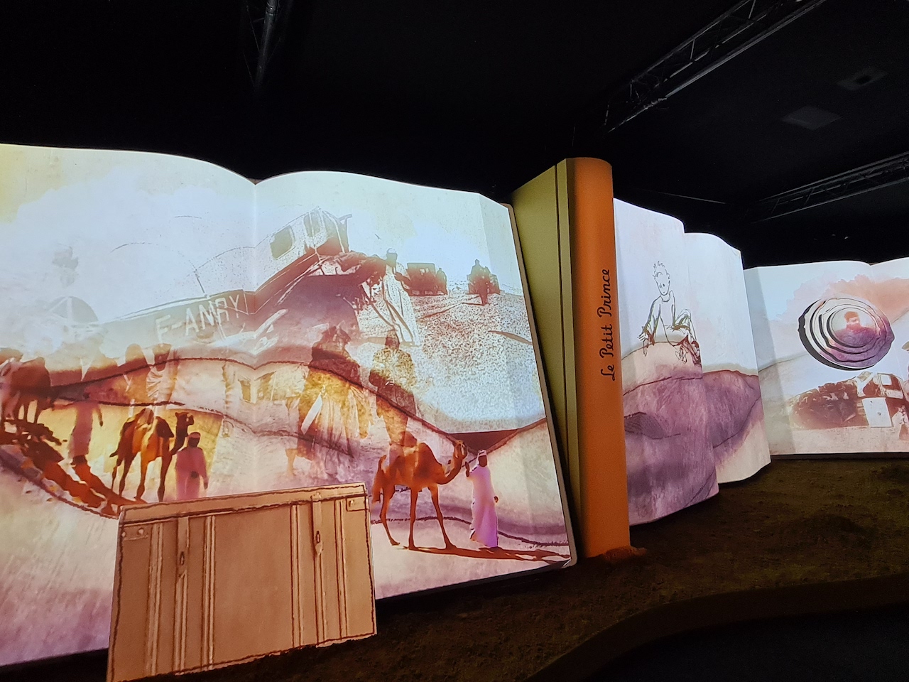 L’exposition débute par une plongée dans l’œuvre la plus célèbre de l’écrivain publiée en 1943, "Le Petit Prince". L’artiste français Arnaud Nazare-Aga propose une expérience s’inspirant du conte en donnant vie aux illustrations d’Antoine de Saint-Exupéry. Ces dernières sont notamment accessibles aux personnes malvoyantes et aveugles. Les yeux doivent ensuite s’habituer à l’obscurité de la salle pour profiter du spectacle et d’un ciel étoilé.