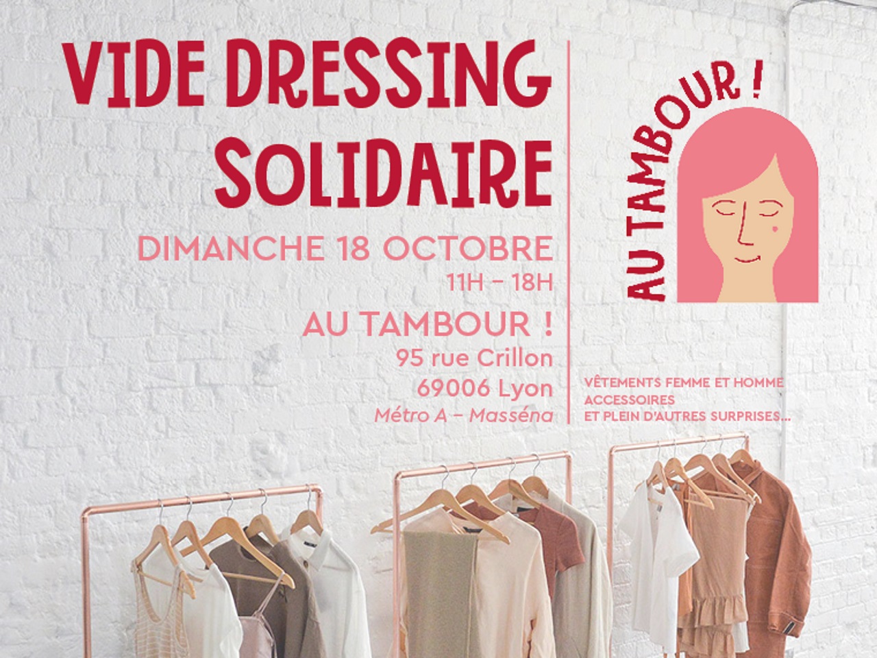 Acheter pour la bonne cause, c’est ce que propose ce dimanche l’association Au Tambour !, premier centre d’accueil de jour dédié au bien-être des femmes victimes de précarité, d’isolement et de violences sur la Métropole de Lyon. Un vide dressing solidaire est organisé de 11h à 18h (95 rue Crillon dans le 6e) avec à saisir des vêtements femmes et hommes, des chaussures et des accessoires à prix libre à partir de 2 euros. L’argent récolté sera entièrement reversé à l’association Au Tambour. Attention places limitées et réservation obligatoire ici