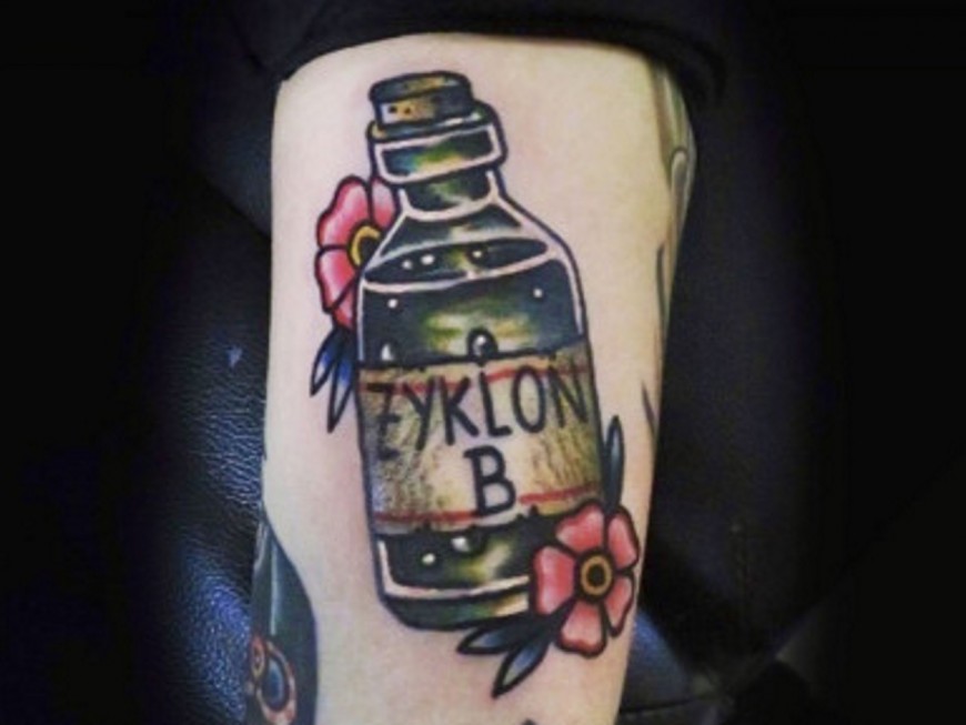 Signaler RépondreEn ce qui me concerne, et peu importe la profession de cette femme, je trouve extrêmement choquant de se tatouer une bouteille de Zyklon B, un gaz meurtrier qui a été utilisé contre des êtres humains dans les chambres à gaz.