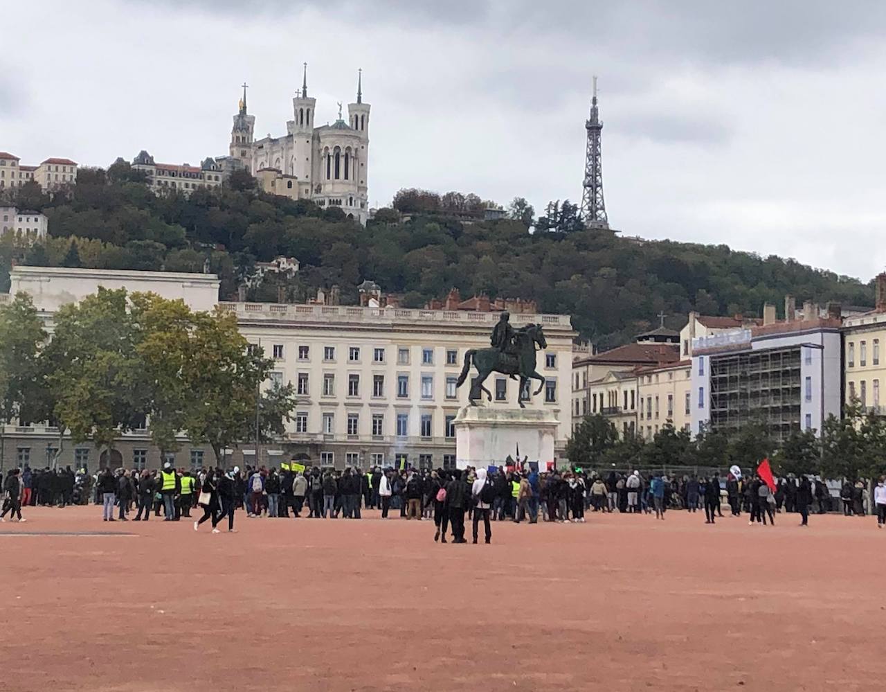 En début d’après-midi, les Gilets jaunes ont donc lancé l’acte 101 sur la place Bellecour. Les quelques dizaines d’opposants au gouvernement ont été rapidement rejoint par des sympathisants du mouvement Black Lives Matter et des personnes dénonçant les violences policières. Selon nos constatations sur place, et conformément aux craintes de la préfecture, de nombreux black blocs sont également venus renforcer les rangs du rassemblement sur la place du 2e arrondissement de Lyon.