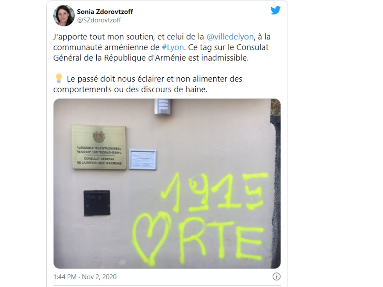 Des tags ont également été découverts dans le 3e arrondissement de Lyon, sur le bâtiment du Consulat général de la République d'Arménie. "1915 RTE" a été inscrit sur la façade, en référence à la date du début du génocide arménien et à Recep Tayyip Erdogan.