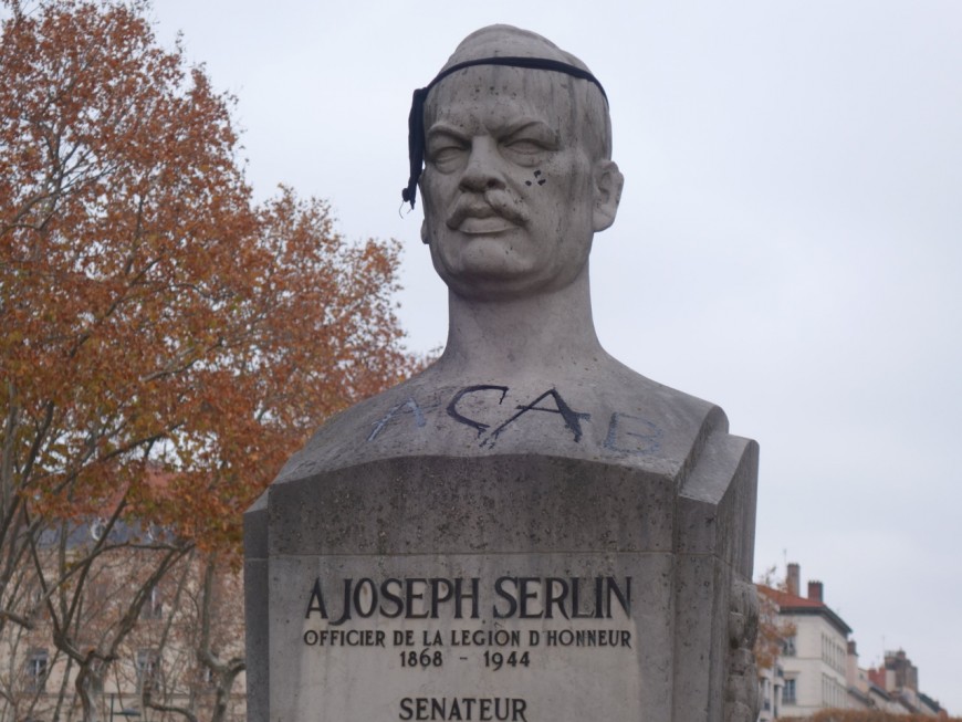 Parmi eux, des tags ont été découverts sur un buste de Joseph Serlin, ancien résistant, qui se trouve place du Maréchal Lyautey dans le 6e arrondissement de Lyon, lieu de départ du cortège ce samedi. Dessus, est inscrit "ACAB", qui signifie en anglais "all cops are bastards" et en français "tous les policiers sont des bâtards". De plus, le crâne du buste a été habillé d’un bandeau noir et trois petits points ont été tagués sur le visage de l’homme. Une signification forte car cela signifie "mort aux vaches".