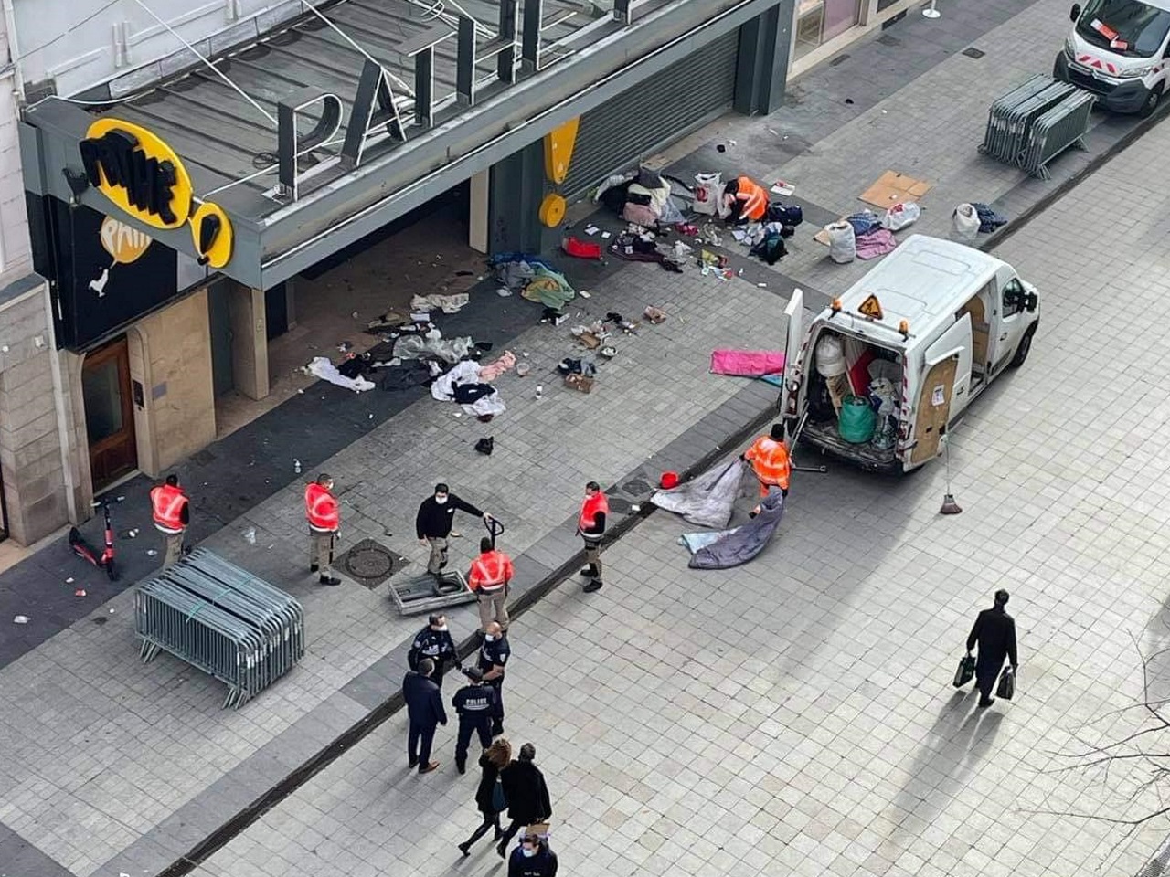 Signaler RépondreDepuis la fermeture du Pathé pour cause de Covid, les éboueurs ont eu beaucoup moins de travail. Les quelques affaires que laisseront ces SDF ne sont rien à comparer des détritus laissés autrefois quotidiennement par les personnes faisant la queue pour aller au cinéma.