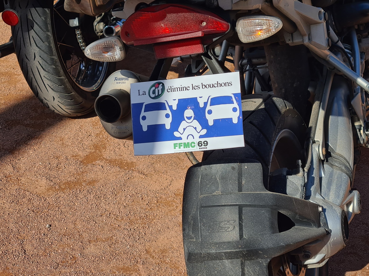 Plusieurs drapeaux étaient de sortie pour l’occasion. Les bikers ont aussi recouvert leur plaque d’immatriculation d’une petite affiche humoristique : "La Cif (circulation inter-files) élimine les bouchons", en faisant le lien avec la marque de produits nettoyants.