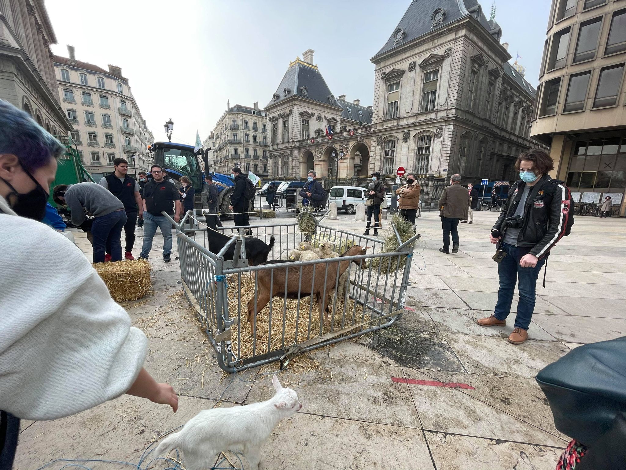 "Macron, défend ton agriculture", "Viande de nos prés -> enfant en bonne santé, environnement préservé" ou encore "laissez-nous travailler" sont autant de slogans promus par les manifestants qui s'étaient installés avec une vingtaine de véhicules sur le quai Jean Moulin. Des chevreaux ont été lâchés sur la place Louis-Pradel, pour le plus grand bonheur des passants et notamment de quelques enfants. "Nous avons amorcé un approvisionnement local des écoles. On balaye tout ce travail d’un revers de la main", s'est plaint Pascal Gerin de la FDSEA du Rhône, avant qu'une délégation ne soit reçue en mairie. Plusieurs élus sont venus soutenir les agriculteurs, et poser avec des chevreaux dans les bras, à l'instar de l'ancien maire Gérard Collomb ou de Jean-Stéphane Chaillet, adjoint au maire du 2e.