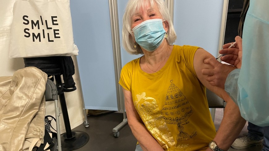 Jocelyne, retraitée, 71 ans, y a reçu sa seconde dose du vaccin de Pfizer. Une injection réalisée sur des airs de "We are the Champions" (Queen), puisqu'il s'agissait de la 100 000e administrée sur le site transformé en vaccinodrome depuis le mois de janvier.