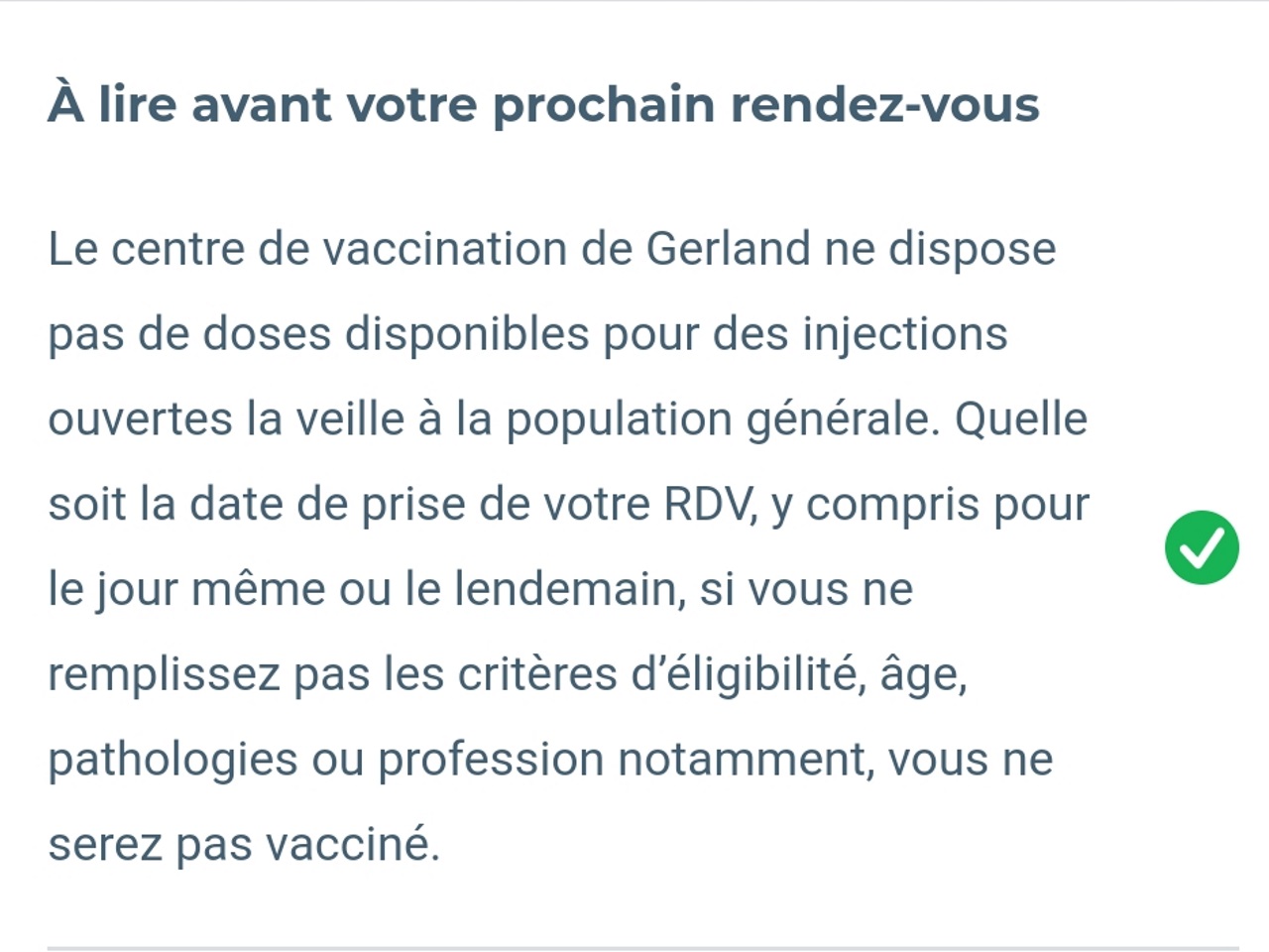 A Lyon, le plus gros centre de vaccination ne sera pas concerné par la mesure. "Le centre de vaccination de Gerland ne dispose pas de doses disponibles pour des injections ouvertes la veille à la population générale. Quelle que soit la date de prise de votre rendez-vous, si vous ne remplissez pas les critères d'éligibilité, d'âge, de pathologie ou de profession, vous ne serez pas vacciné", peut-on lire sur Doctolib.