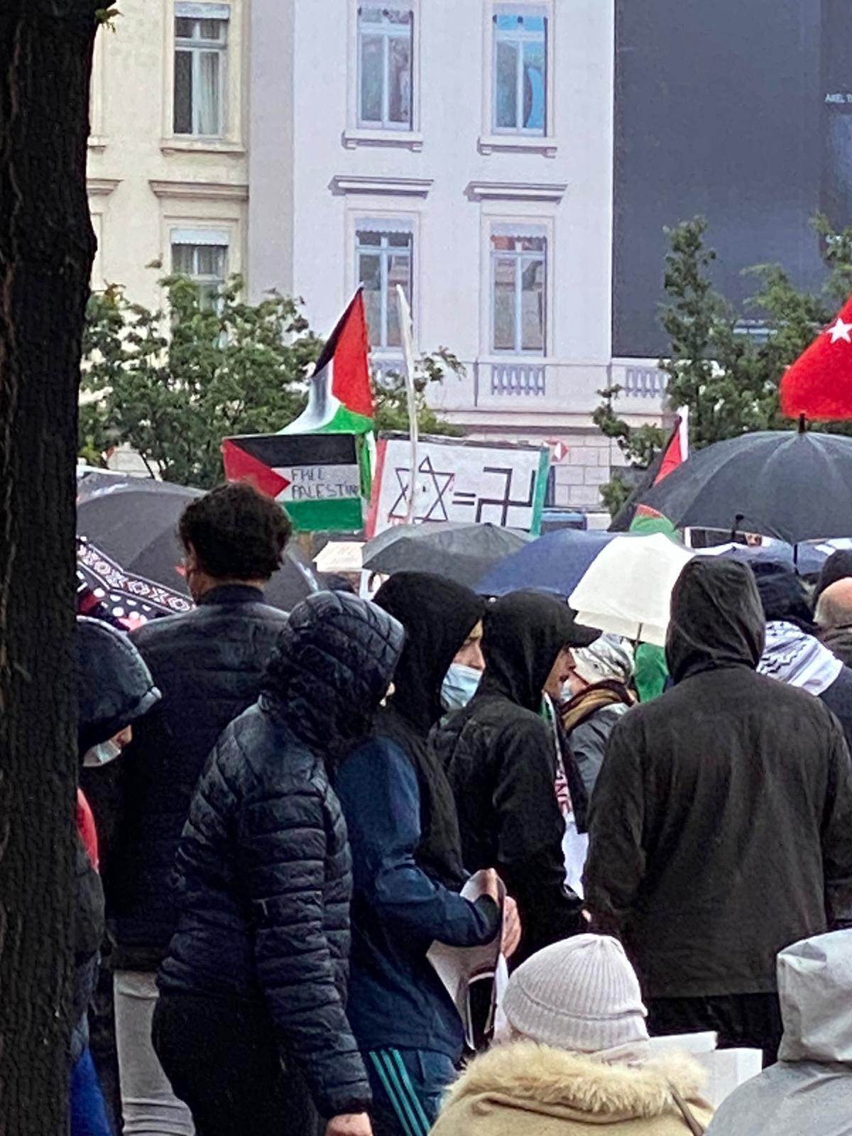 A noter que dans le cortège on a notamment pu apercevoir une pancarte comparer l'Étoile de David à la croix gammée (voir photo).