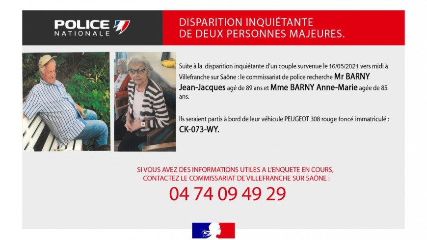 Jean-Jacques Barny et Anne-Marie Barny, âgés respectivement de 89 ans et 85 ans, ont été vus pour la dernière fois à Villefranche-sur Saône vers midi dimanche dernier.