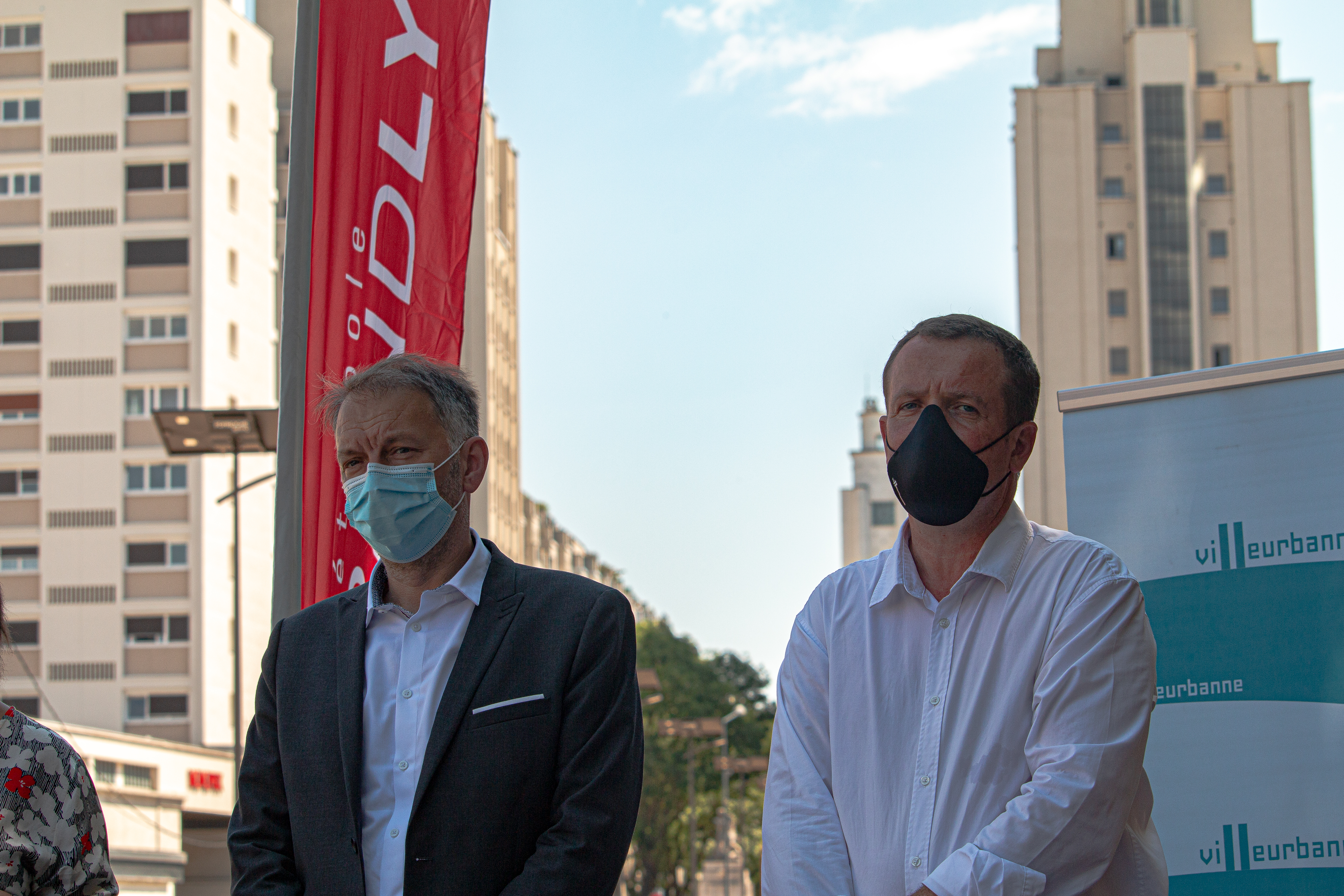 Et puisqu’il faut bien commencer quelque part, c’est au pied des Gratte-ciel que presse et acteurs locaux étaient conviés pour entamer la visite. "Il y a peu de villes en France où l’on peut se permettre de doubler la taille de son centre-ville", a déclaré Cédric Van Styvendael. Car comme cela était déjà prévu dans le projet initial, l’avenue très commerçante Henri Barbusse, qui sépare les deux tours, verra sa longueur doublée à l’horizon 2030. Elle finira sa course au parc du Centre, reconnaissable par sa cheminée témoin du passé industriel de Villeurbanne. De ce fait, le centre-ville engloutira la rue Léon Chomel et le lycée Pierre Brossolette pour ajouter huit hectares à sa superficie.