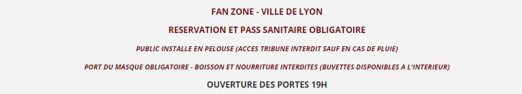Pour ce grand rendez-vous, une fan-zone sera installée sur la mythique pelouse du Matmut Stadium de Gerland. Ce lundi matin, des places sont encore disponibles pour assister à ce match. Pour rappel, en raison de la situation sanitaire, le port du masque restera obligatoire et il faudra présenter un pass sanitaire valide (test antigénique ou PCR moins de 48 heures ou vaccin complet).