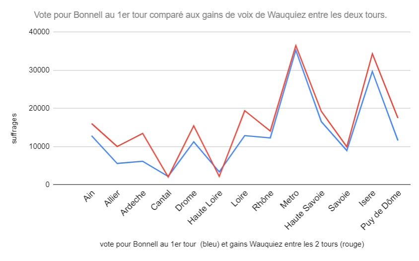 C’est uniquement en Ardèche et dans la Loire que les voix de Bruno Bonnell sont inférieures au gain de Laurent Wauquiez au 2e. Ce sont dans ces deux départements que l’augmentation de la participation a été la plus forte (respectivement plus 7000 personnes et plus 5000). Ce sont ces électeurs, apparus au second tour, qui ont dû voter pour le président sortant de la Région, en renfort de ceux de Bruno Bonnell issus du premier.