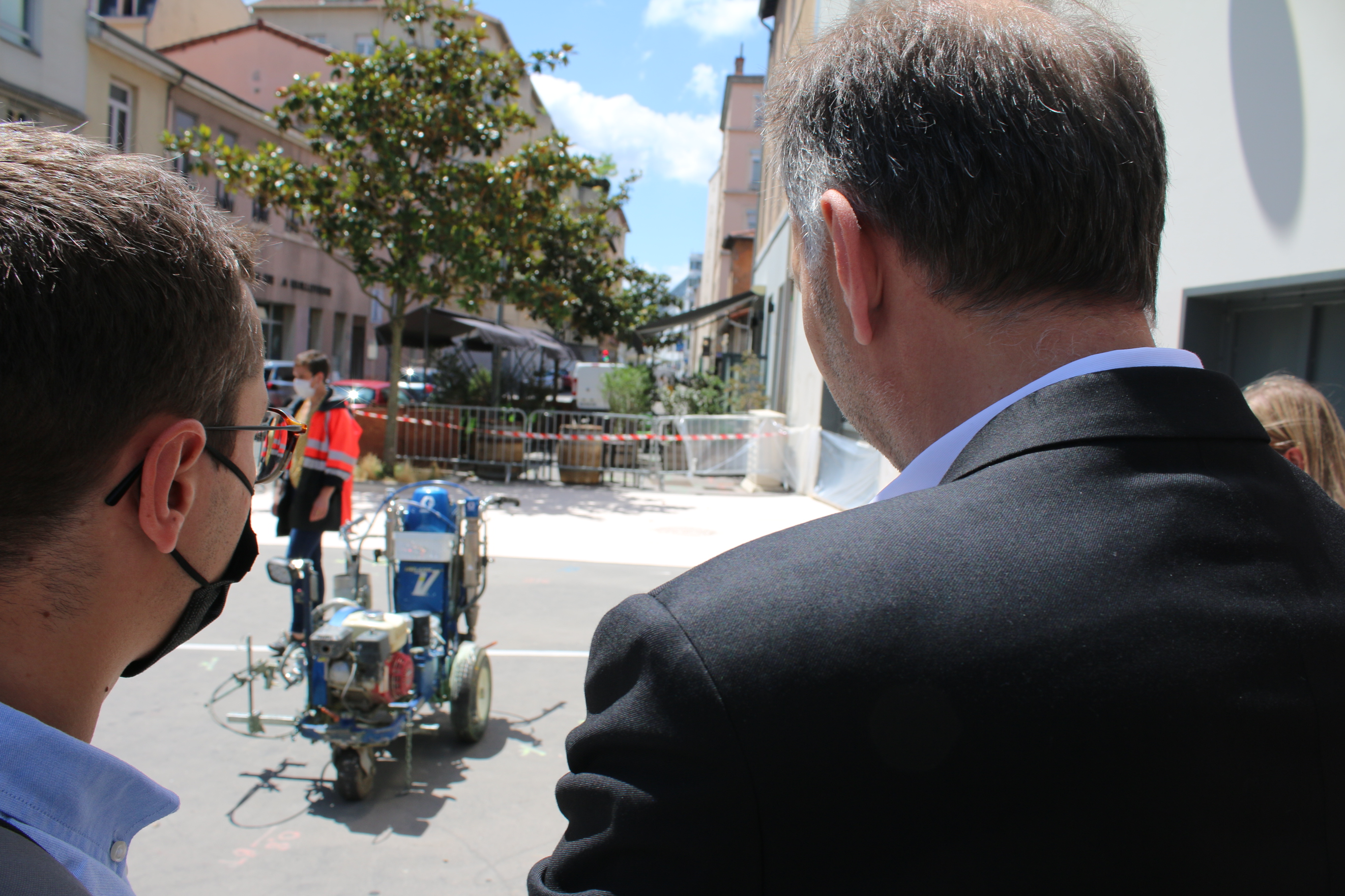 "Cette peinture nous permet aujourd'hui de passer de 45°C à 35°C", a démontré le président de la Métropole de Lyon venu constater l'application de "Climat'ROAD" rue Béchevelin, dans le 7e arrondissement de Lyon. "C'est notre responsabilité d'innover pour voir si ce sont des solutions pérennes pour gagner sur la chaleur dans la Métropole", a poursuivi Bruno Bernard.
