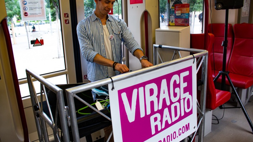 Le tramway reliant Lyon à l'aéroport de Saint-Exupery a été investi par un DJ de Virage Radio, une radio électrorock, pour célébrer la mise en place inédite des tarifs estivaux. Boisson fraîche, petits fours et musique : tout était réuni pour fêter la nouvelle.