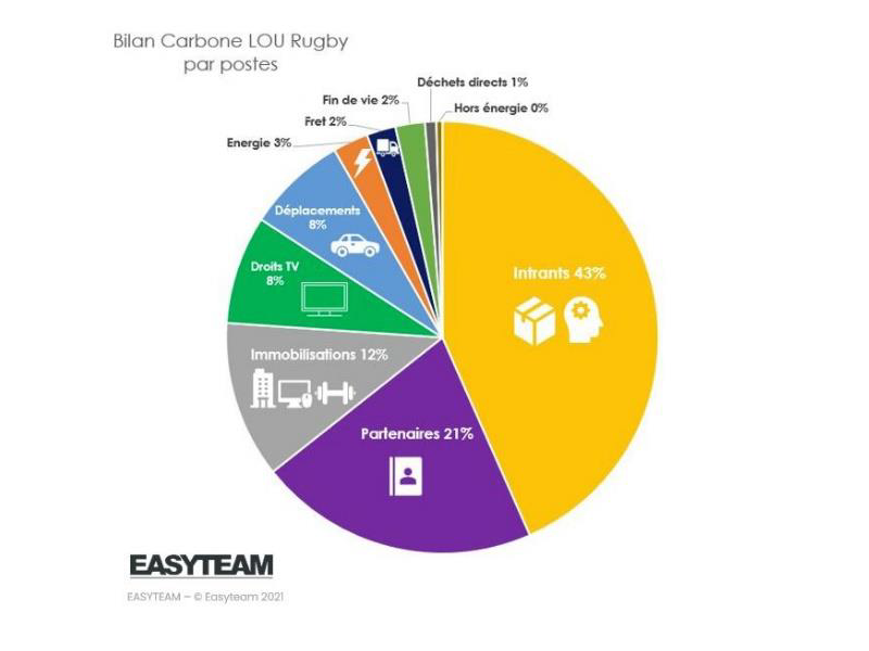Selon les résultats, ce bilan carbone est estimé à 19 000 tonnes équivalent C02. Les intrants (achats de biens et services) représentent la plus grosse part du bilan carbone du club avec 43%. Suivent les partenaires avec 21%, les immobilisations (bâtiments, équipements, machines et véhicules) et les déplacements avec 8%.