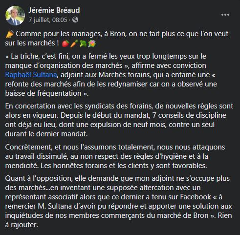 Après les mariages, la municipalité de Bron a décidé de mettre en place de nouvelles règles sur les marchés. Sur ses réseaux sociaux, Jérémie Bréaud, le maire de la commune, a annoncé s'attaquer "au travail dissimulé, au non-respect des règles d'hygiène et à la mendicité. Les honnêtes forains et les clients y sont favorables". "Comme pour les mariages, à Bron, on ne fait plus ce que l'on veut sur les marchés".
